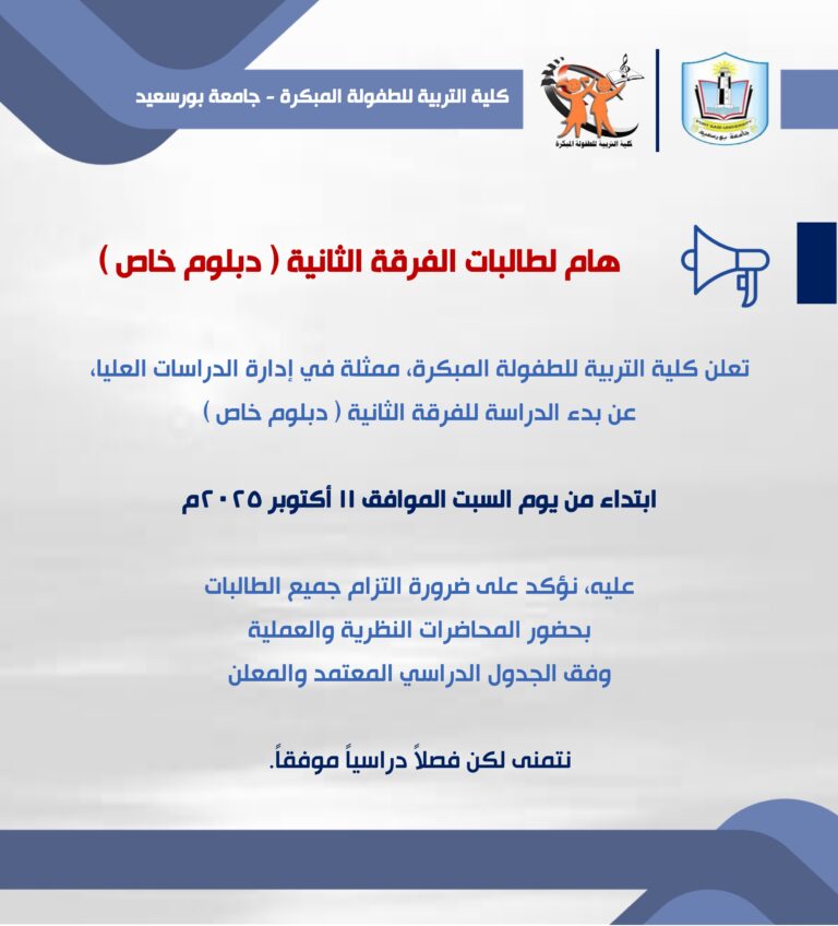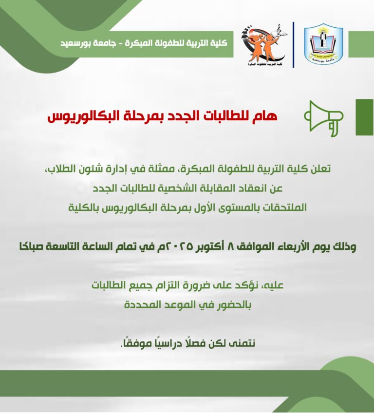 كلية التربية للطفولة المبكرة - جامعة بورسعيد أحدث أخبارنا أكتوبر 7, 2025هام لطالبات الفرقة الثانية ( دبلوم خاص )أكتوبر 6, 2025هام للطالبات الجدد بمرحلة البكالوريوسأكتوبر 5, 2025هام لطالبات الدراسات العليا مركز الأخبار نشأتنا أنشأت الكلية بمقتضى القرار الجمهورى رقم 354 لسنة 2007 بشأن كلية رياض الأطفال وقد بدأت الدراسة بها عام 2008/2007 مؤتمرات ندوات ورش عمل اعرف المزيد الكلية في أرقام 1 طالب 1 باحث 1 عضو هيئة تدريس 1 أبحاث منشورة