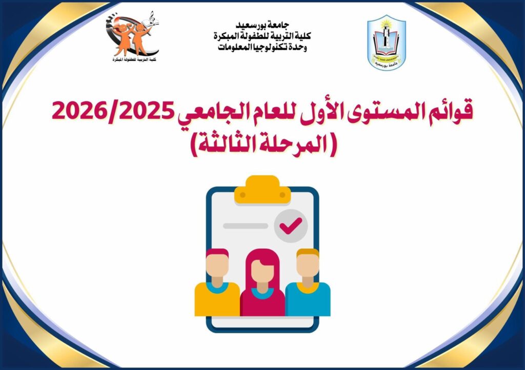 قوائم المستوى الاول للعام الجامعي 2025/2026 ( المرحلة الثالثة) أخبار التعليم والطلاب, كشوف المقبولين – طلاب, ملفات, ملفات - طلاب / Kind Author قوائم المستوى الاول للعام الجامعي 2025/2026 ( المرحلة الثالثة) قراءة المزيد »