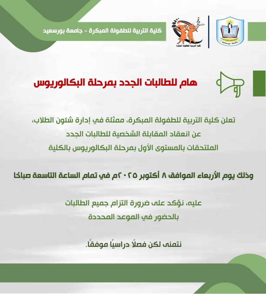 تحت رعاية الأستاذ الدكتور/ أماني ابراهيم الدسوقي عميد كلية التربية للطفولة المبكرة بجامعة بورسعيد، وفي إطار استقبال الطلاب الجدد للعام الجامعي 2025-2026، أجرت كلية التربية للطفولة المبكرة اليوم الإثنين الموافق 22 سبتمبر 2025، أولى جلسات المقابلات الشخصية للطالبات الجدد الملتحقين بالفرقة الأولى. جرت المقابلات بحضور عميد الكلية، التي رحبت بالطالبات الجدد وأكدت على أهمية هذه