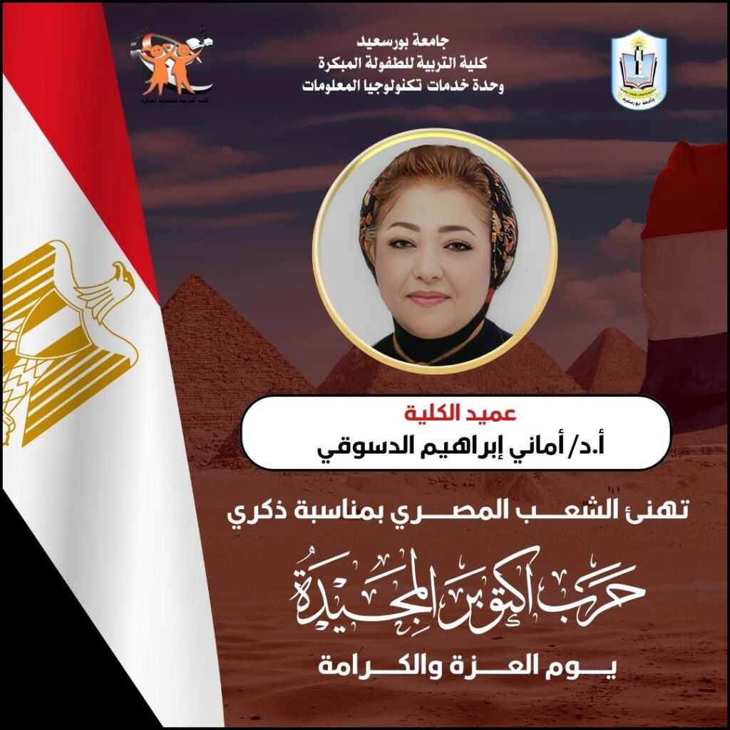 بكل فخر واعتزاز، تتقدم الأستاذة الدكتورة/ أماني الدسوقي عميدة كلية التربية للطفولة المبكرة – جامعة بورسعيد بخالص التهاني القلبية إلى فخامة السيد الرئيس عبد الفتاح السيسي – رئيس الجمهورية والقائد الأعلى للقوات المسلحة وإلى قواتنا المسلحة الباسلة، والشعب المصري العظيم بمناسبة الذكرى الخالدة لانتصارات السادس من أكتوبر المجيدة تلك الملحمة الخالدة التي جسدت أعظم معاني البطولة والتضحية والانتماء وأثبتت أن المصريين قادرون على تحقيق المعجزات متى اجتمعوا على قلب وطنٍ واحد