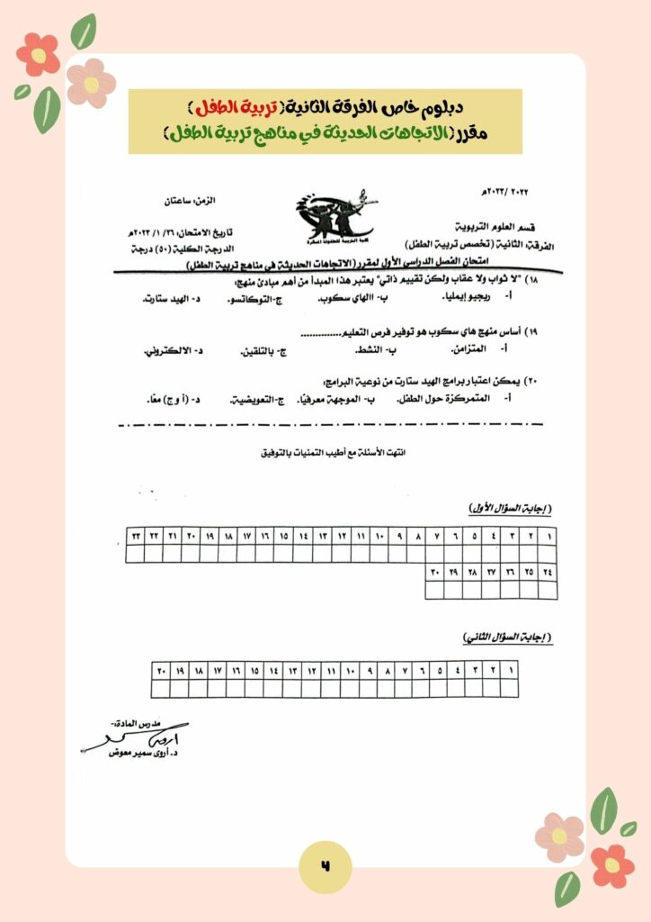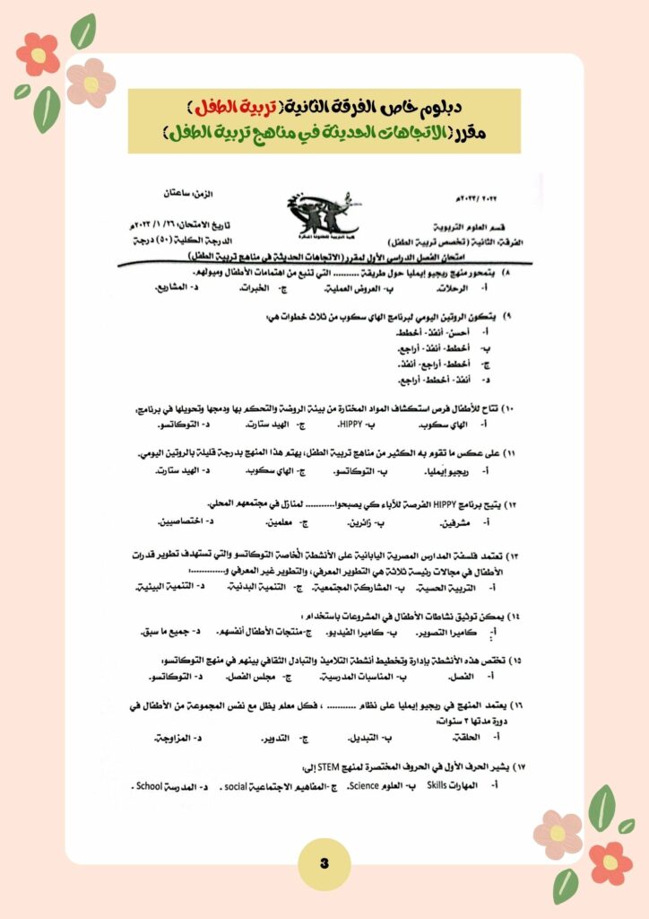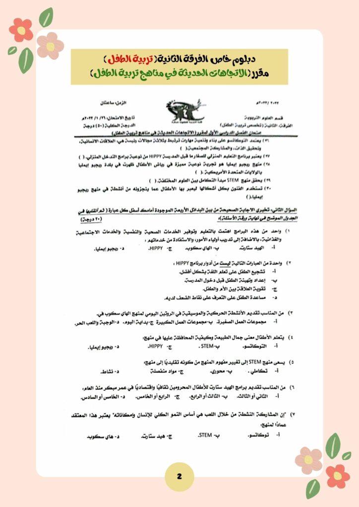 امتحان مقرر الاتجاهات الحديثة في مناهج تربية الطفل الفصل الدراسي الأول 2023/2022 دبلوم خاص الفرقة الثانية تربية الطفلبواسطة Kind Author / يونيو 19, 2023