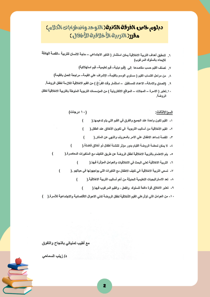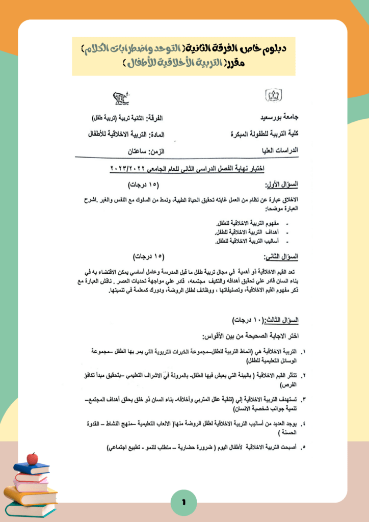 امتحان مقرر التربية الأخلاقية للأطفال الفصل الدراسي الثاني 2023/2022 دبلوم خاص الفرقة الثانية التوحد و اضطرابات الكلامبواسطة Kind Author / يوليو 15, 2023