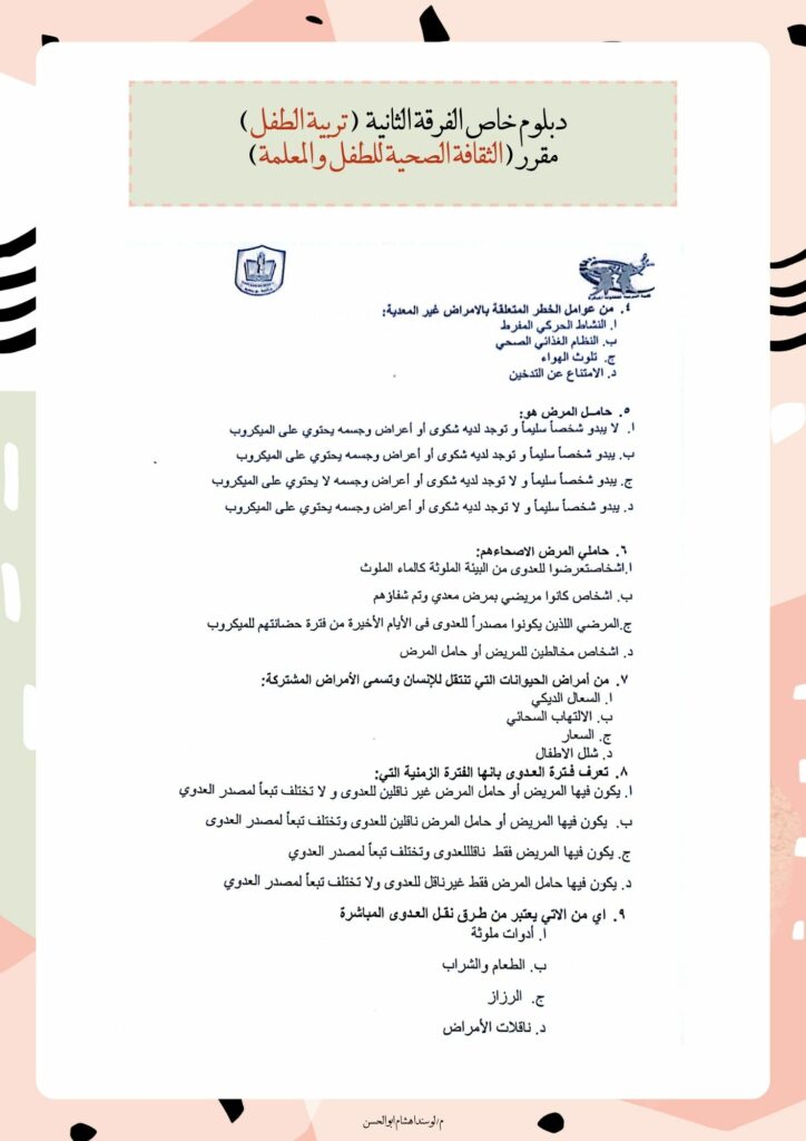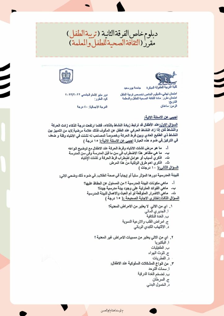 امتحان مقرر الثقافة الصحيةللطفل والمعلمة الفصل الدراسي الثاني 2023/2022 دبلوم خاص الفرقة الثانية (تربية الطفل)بواسطة Kind Author / سبتمبر 1, 2023