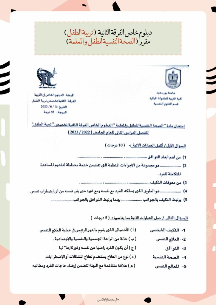 امتحان مقرر الصحة النفسية للطفل والمعلمة الفصل الدراسي الثاني 2023/2022 دبلوم خاص الفرقة الثانية (تربية الطفل)بواسطة Kind Author / سبتمبر 1, 2023