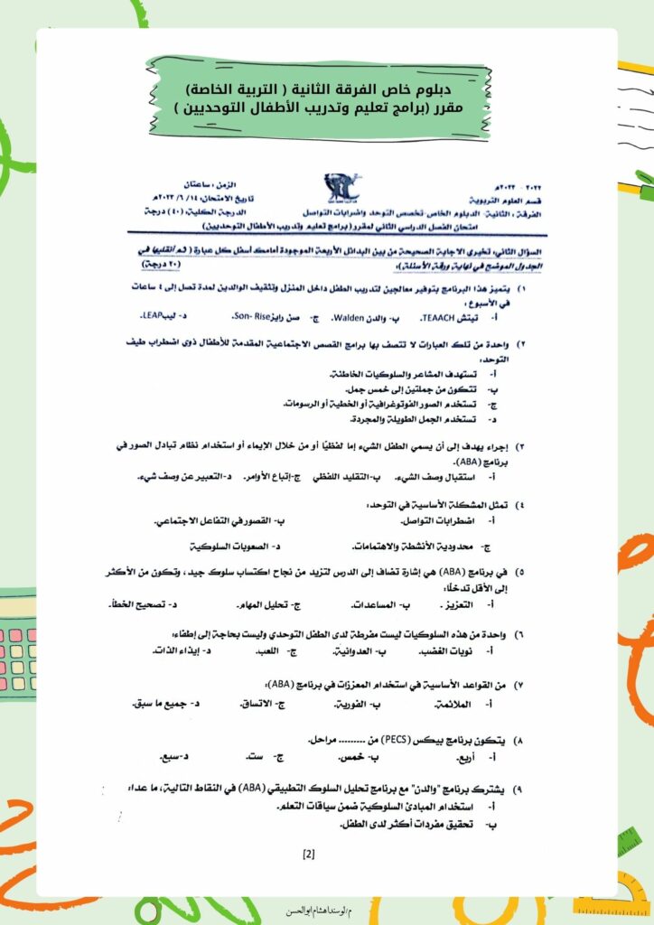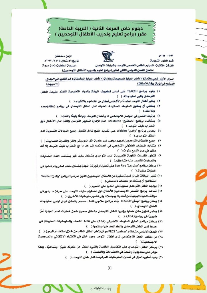 امتحان مقرر برامج تعليم وتدريب الأطفال التوحديين الفصل الدراسي الثاني 2023/2022 دبلوم خاص الفرقة الثانية (التربية الخاصة)بواسطة Kind Author / سبتمبر 1, 2023