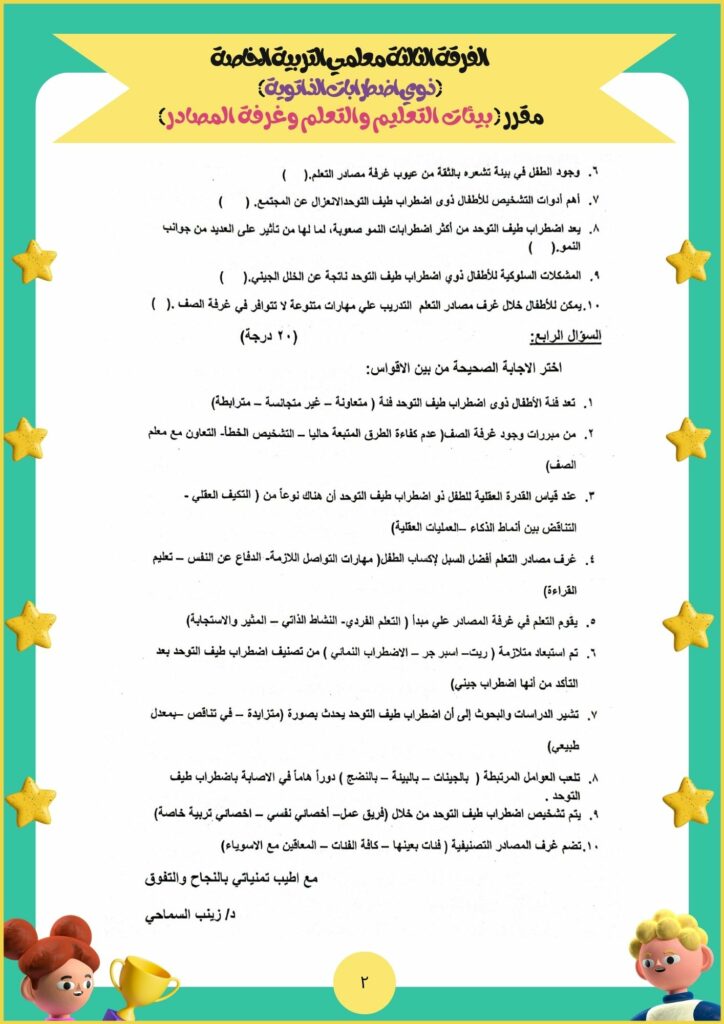 امتحان مقرر بيئات التعليم والتعلم وغرفة المصادر الفصل الدراسي الأول 2023/2022 الفرقة الثالثة التربية الخاصة ذوي اضطرابات الذاتويةبواسطة Kind Author / يونيو 20, 2023