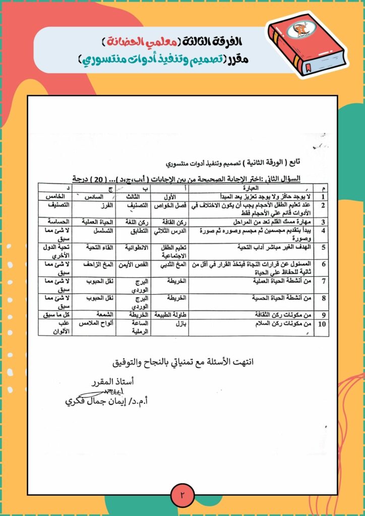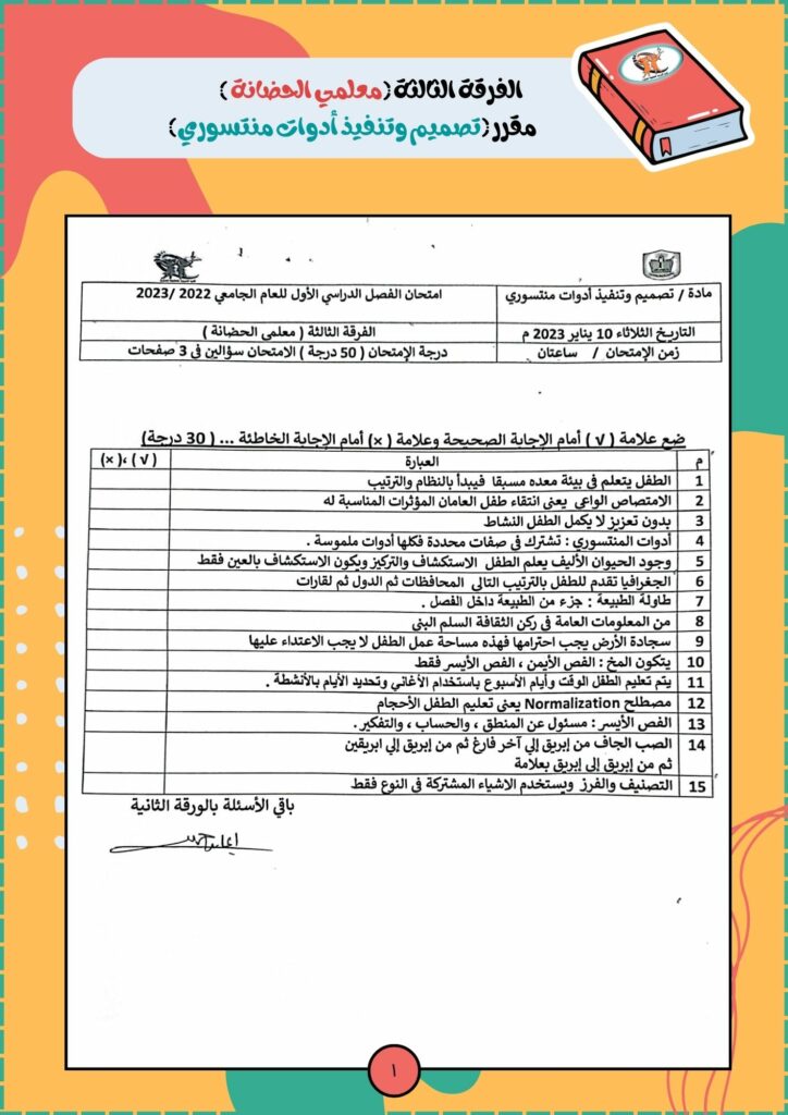 امتحان مقرر تصميم وتنفيذ أدوات منتسوري الفصل الدراسي الأول 2023/2022 الفرقة الثالثة (معلمي الحضانة)بواسطة Kind Author / يونيو 16, 2023