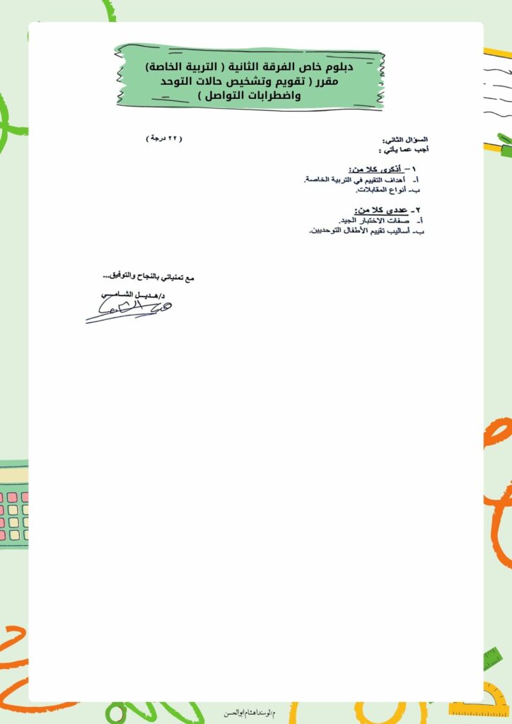 امتحان مقرر تقويم وتشخيص حالات التوحدواضطرابات التواصل الفصل الدراسي الثاني 2023/2022 دبلوم خاص الفرقة الثانية (التربية الخاصة)بواسطة Kind Author / سبتمبر 2, 2023