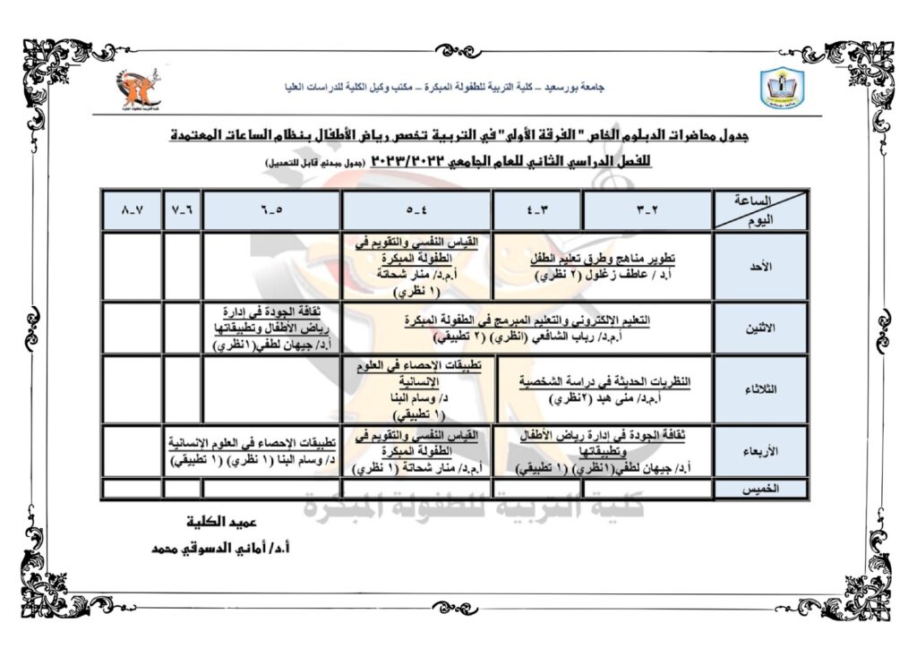 جدول محاضرات الدبلوم الخاص” الفرقة الأولى” في التربية تخصص رياض الاطفال للفصل الدراسي الثاني للعام الجامعي 2023/2022( جدول مبدئي قابل للتعديل)بواسطة Kind Author / فبراير 23, 2023
