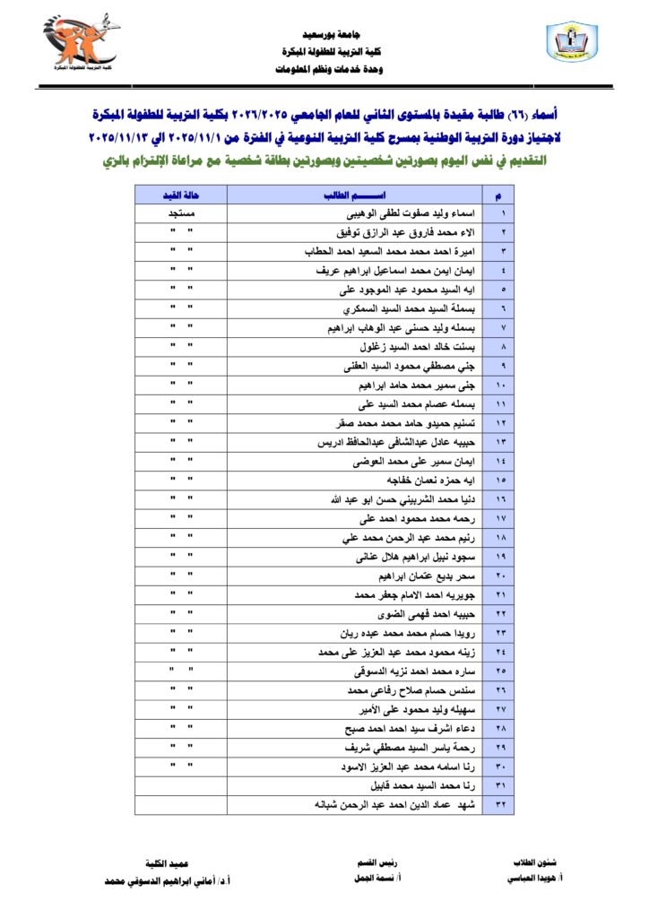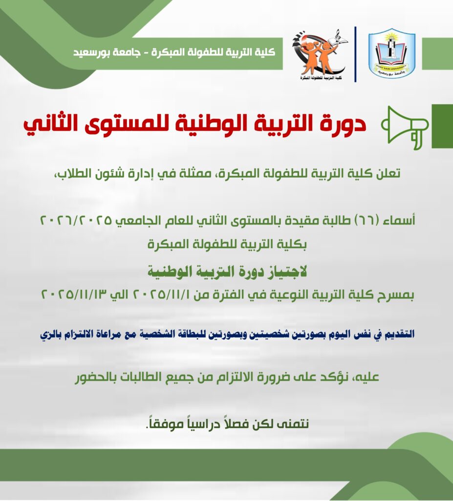 أسماء طالبات المستوى الثاني بكلية التربية للطفولة المبكرة لحضور دورة التربية الوطنية بمسرح كلية التربية النوعية في الفترة من 1/11/2025 الي 13/11/2025بواسطة Kind Author / أكتوبر 20, 2025